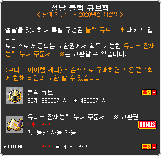 설날 에디셔널 큐브팩 큐브는 기간제한이 없으며 보너스로 나오는 에픽잠재주문서, 유니크 잠재주문서, 에디셔널 에픽잠재 주문서는 기간제 입니다. 최대한 늦게까지 가지고 있으려면 2월12일에 구매후 7일후에 캐시창의 큐브교환권을 까고 또다시 7일후에 보너스아이템을 까면 최대한 오래 가지고있다가 팔거나 내 아이템에 사용하거나 할 수 있습니다.