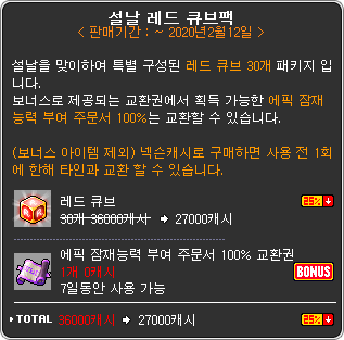 설날 에디셔널 큐브팩 큐브는 기간제한이 없으며 보너스로 나오는 에픽잠재주문서, 유니크 잠재주문서, 에디셔널 에픽잠재 주문서는 기간제 입니다. 최대한 늦게까지 가지고 있으려면 2월12일에 구매후 7일후에 캐시창의 큐브교환권을 까고 또다시 7일후에 보너스아이템을 까면 최대한 오래 가지고있다가 팔거나 내 아이템에 사용하거나 할 수 있습니다.