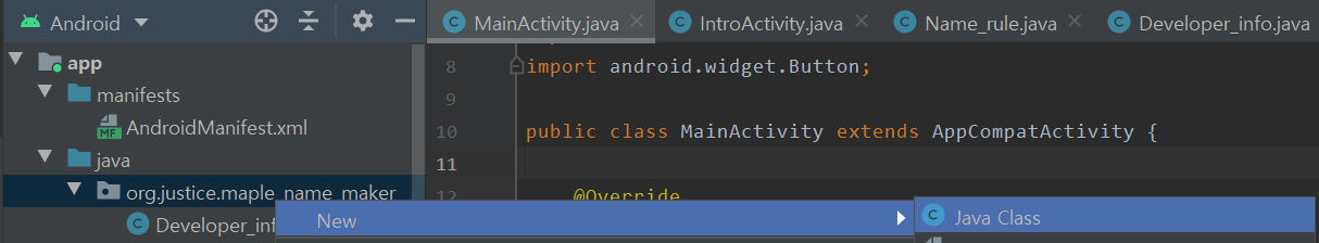 package org.justice.maple_name_maker; import androidx.appcompat.app.AppCompatActivity; import android.content.Intent; import android.os.Bundle; import android.view.View; import android.widget.Button; public class MainActivity extends AppCompatActivity { @Override protected void onCreate(Bundle savedInstanceState) { super.onCreate(savedInstanceState); setContentView(R.layout.activity_main); //개발자 정보 버튼 클릭시 액티비티 전환 Button developer_info_btn = (Button) findViewById(R.id.developer_info_btn); developer_info_btn.setOnClickListener(new View.OnClickListener(){ @Override public void onClick(View view){ Intent intent = new Intent(getApplicationContext(), Developer_info.class); startActivity(intent); } }); //닉네임규정 버튼 클릭시 액티비티 전환 Button name_rule_btn = (Button) findViewById(R.id.name_rule_btn); name_rule_btn.setOnClickListener(new View.OnClickListener(){ @Override public void onClick(View view){ Intent intent = new Intent(getApplicationContext(), Name_rule.class); startActivity(intent); } }); } }findViewById 는 레이아웃에서 내 버튼을 찾아오는 부분입니다. 아까 버튼 id를 입력해주면 됩니다.