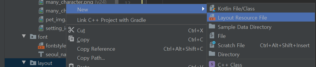 layout 오른쪽마우스 - New - Layout Resourse File 로 레이아웃을 생성해 줍니다.