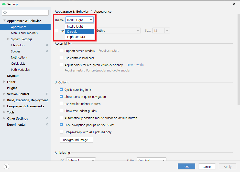 설정에서 Darcula를 선택하고 OK를 눌러 다크모드로 전환해줍니다.