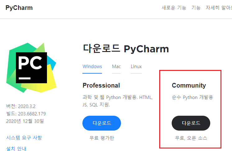 www.jetbrains.com/ko-kr/pycharm/download/#section=windows