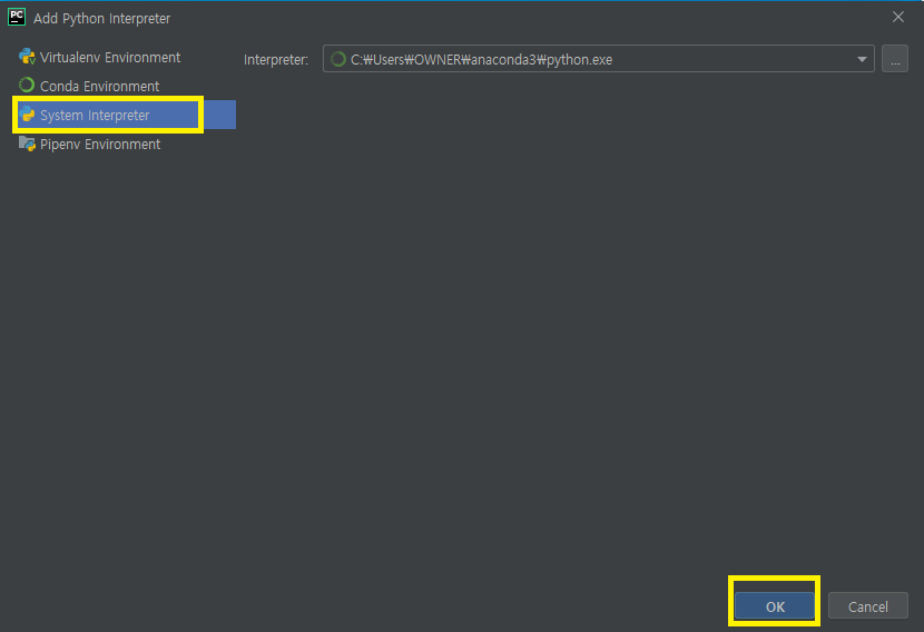 Add Python Interpreter가 열리게 되고 System Interpreter를 클릭하고 OK 해줍니다.
