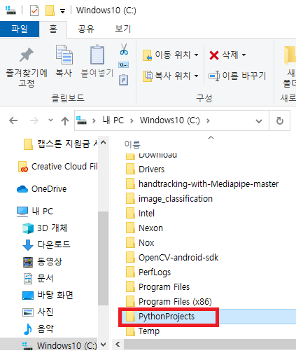 파이참 파일을 찾기 쉽게 C드라이브에 'PythonProjects' 이름으로 저장하였습니다.
