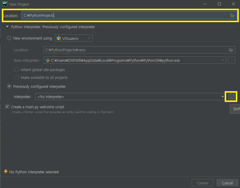 Previously configured interpreter로 선택하고 점 세개를 누릅니다.