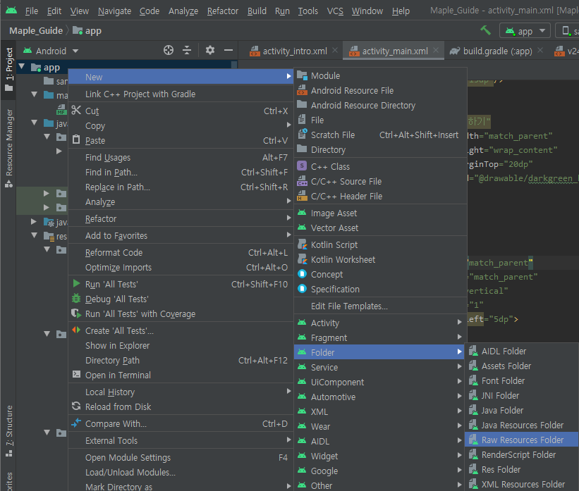 이제 gif 이미지를 안드로이드 내에 삽입해야하는데요, 중요한건 res 폴더에 raw 폴더를 생성해서 넣어야합니다.