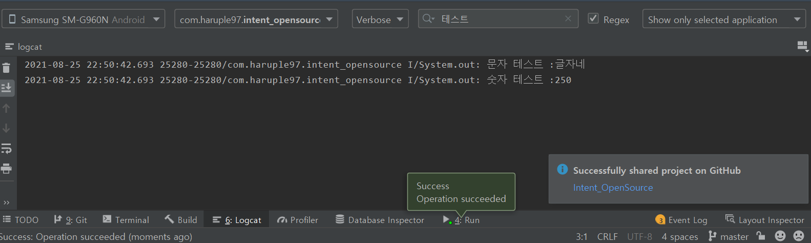 Logcat 출력 이처럼 MainActivity에 있던 변수 값을 SubActivity로 올바르게 이동시켰습니다!