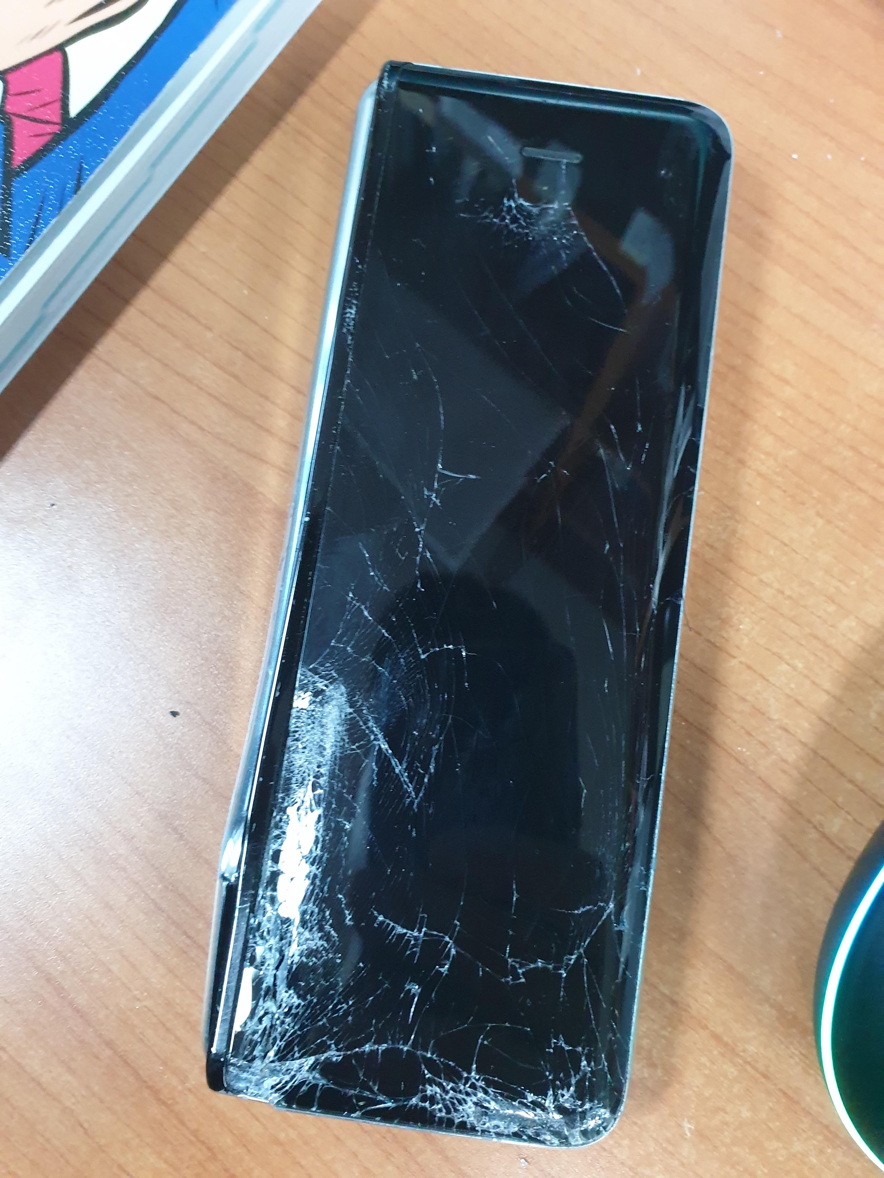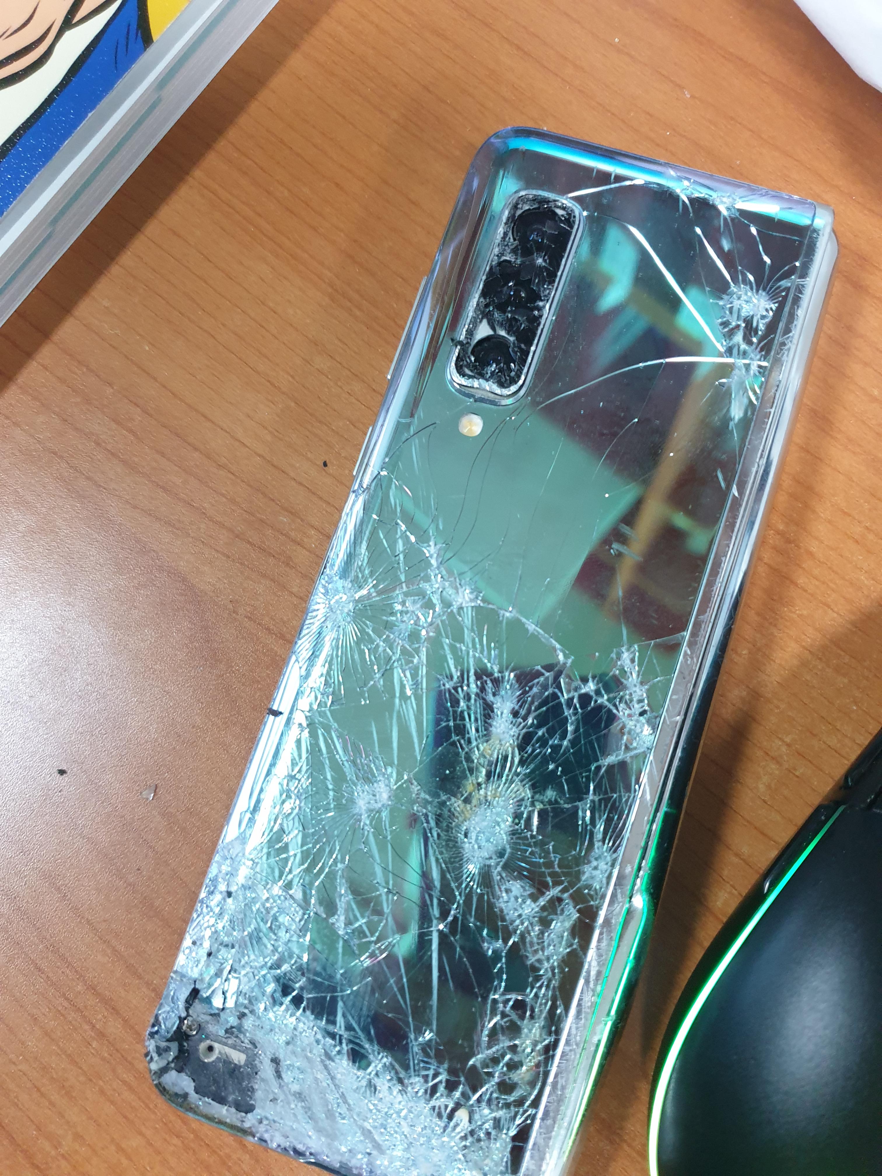 박살난 1세대 갤럭시폴드 이때 몸도 다쳤지만 폰 박살난거 보고 놀래서 바로 데이터부터 옮기고 병원갔네요...휴