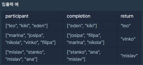 마라톤에 참여한 선수들의 이름이 담긴 배열 participant와 완주한 선수들의 이름이 담긴 배열 completion이 주어질 때, 완주하지 못한 선수의 이름을 return 하도록 solution 함수를 작성해주세요.