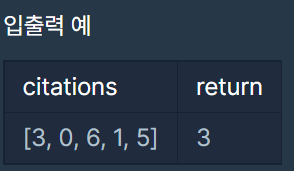 입출력 예를보면 조금 이해가 쉬운데요, 이 과학자가 발표한 논문의 수는 5편이고 그중 3편의 논문은 3회 이상 인용 되었습니다. 나머지 2편의 논문은 3회 이하 인용되었기 때문에 이 과학자의 H-Index는 3입니다.