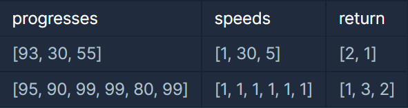 - 작업의 개수(progresses, speeds배열의 길이)는 100개 이하입니다.
