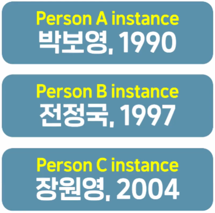 1990년생 박보영, 1997년생 전정국, 2004년생 장원영이 있다면 프로그램에서는 같은 Person 클래스로 세 사람의 인스턴스를 만들어 사용하게 됩니다.