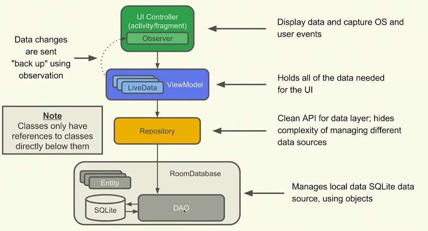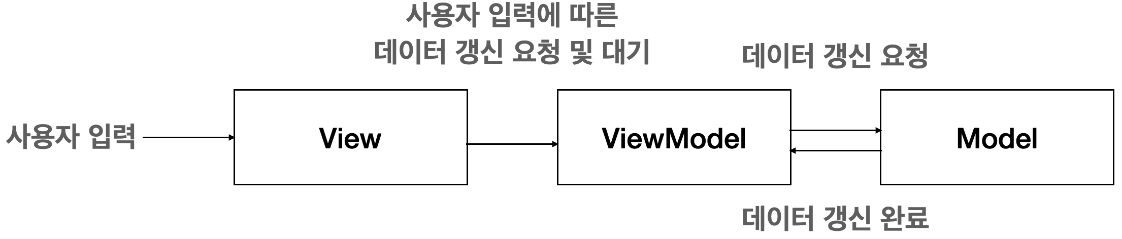 - DB사용이나 Retrofit을 통한 백엔드 API 호출이 보편적이다. (Repository, Database 부분)View가 필요로 하는 데이터는 ViewModel이 가지고 있고, View는 그 데이터를 필요로 하기 때문에 ViewModel이 가진 데이터를 관찰(Observing) 한다.