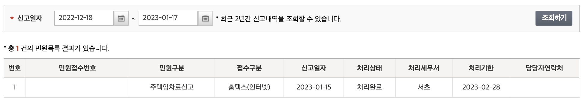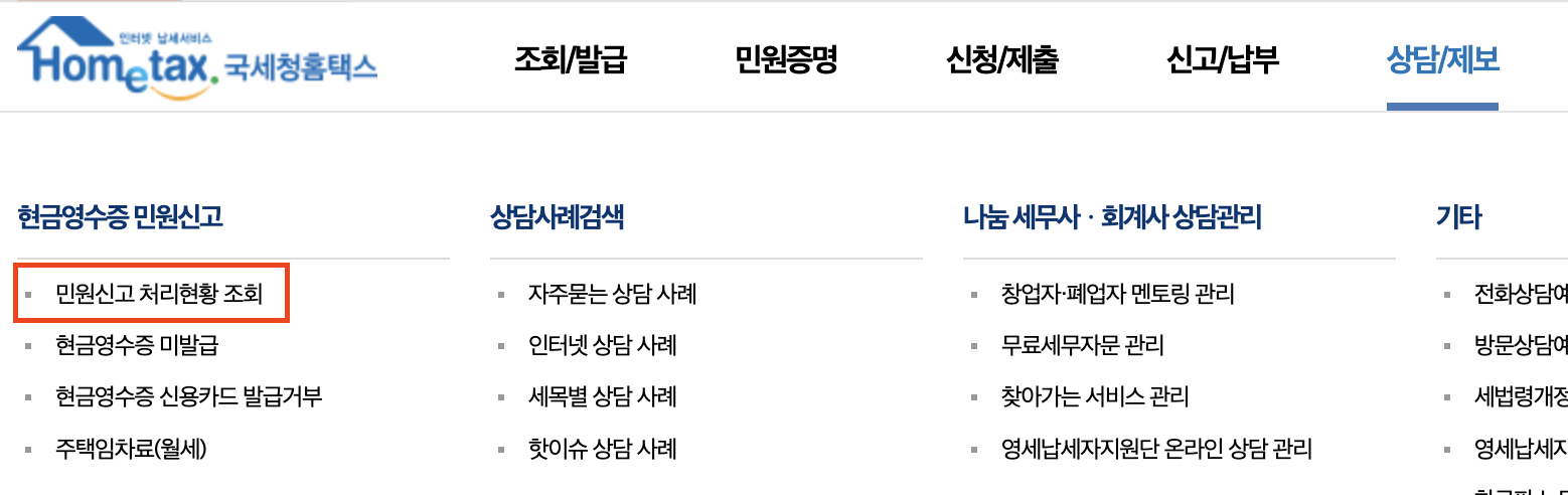 국세청홈택스 - 상담/제보 - 민원신고 처리 현황 조회
