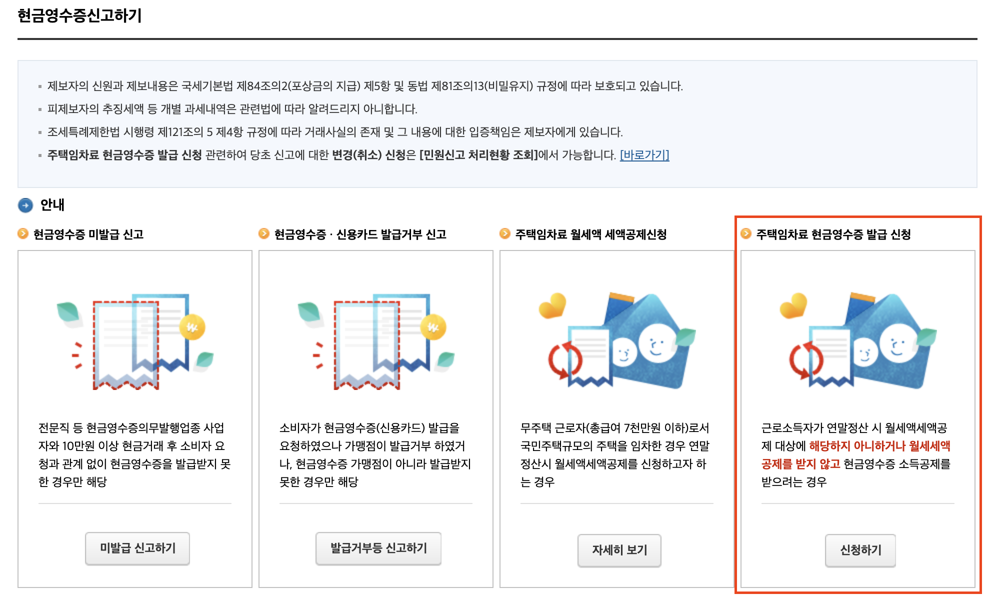 가장 우측의 주택임차료 현금영수증 발급 신청으로 들어갑니다.