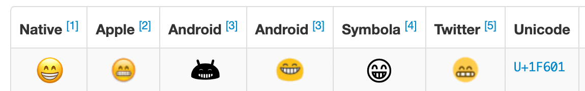 Emoji code points and example glyphs using web fonts, sprites and native OS representation of Emoji characters