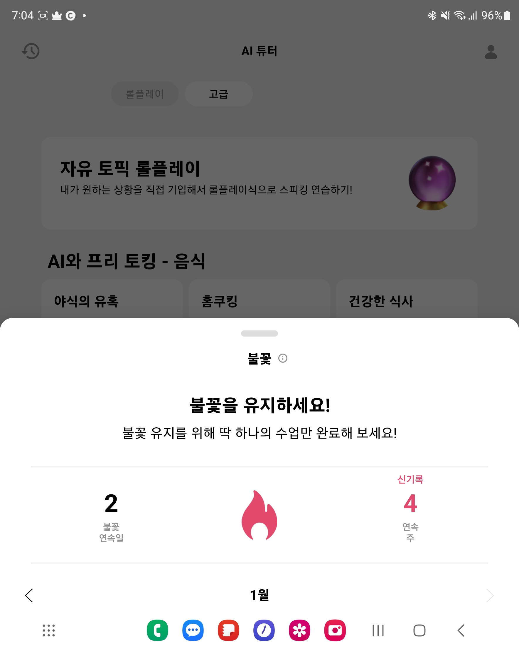 Bottom Sheet Dialog를 사용하는 다른 앱을 찾아보았는데요, 제가 사용하던 '스픽' 이라는 영어 스피킹 앱에서 Bottom Sheet Dialog를 이용해 캘린더를 적용한 모습을 볼 수 있었습니다.