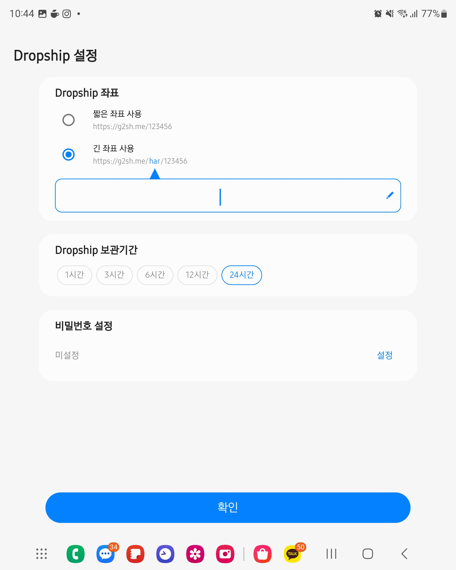 해당 설정에서 공유할 링크를 만들 수 있습니다. 링크를 조금 더 복잡하게 만들거나 링크가 유효한 시간, 비밀번호를 설정할 수 있습니다.