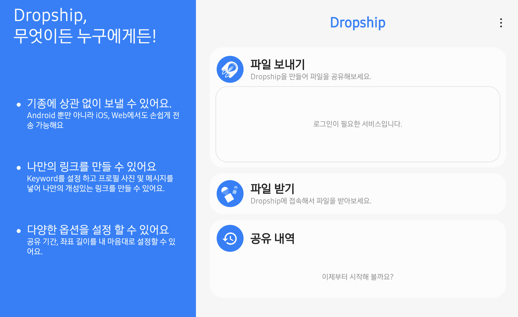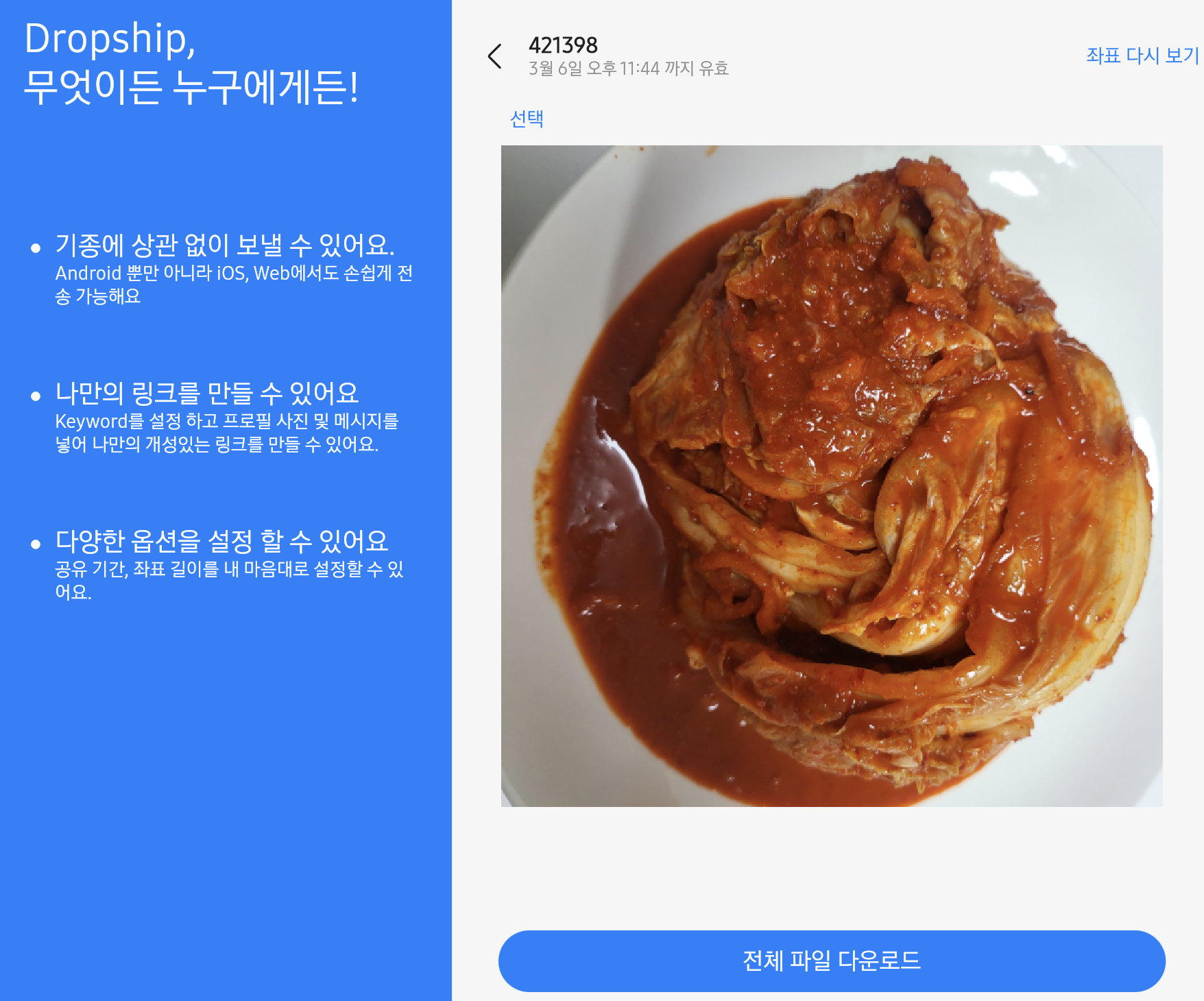 그리고 이전에 개발되어 있던 드랍쉽은 갤럭시에서 갤럭시끼리는 공유가 쉽지만, IOS로 옮기려면 QR 코드를 공유해야 하는 등 번거로운 과정이 있었습니다. 그래서인지 삼성에서 새로운 공유 소프트웨어 Dropship을 개발했습니다.