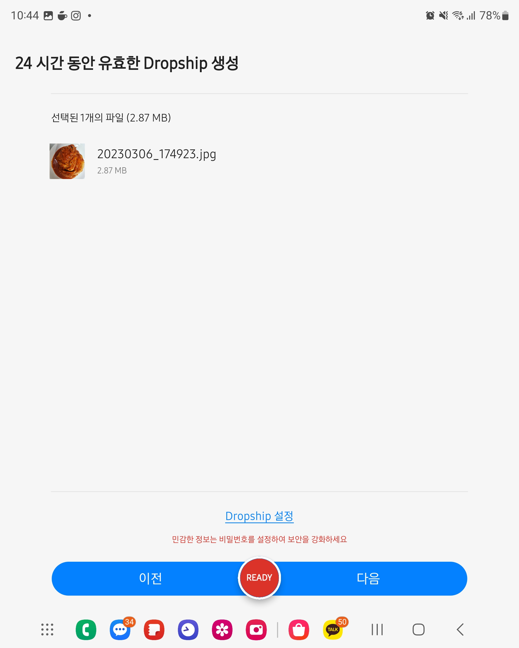 여기서 별로 보안이 중요한 파일이 아니면 Dropship 설정을 누르지 않고 그냥 바로 다음을 눌러서 전송하면 되고, 보안이 필요하다 싶으면 Dropship 설정을 누르세요.